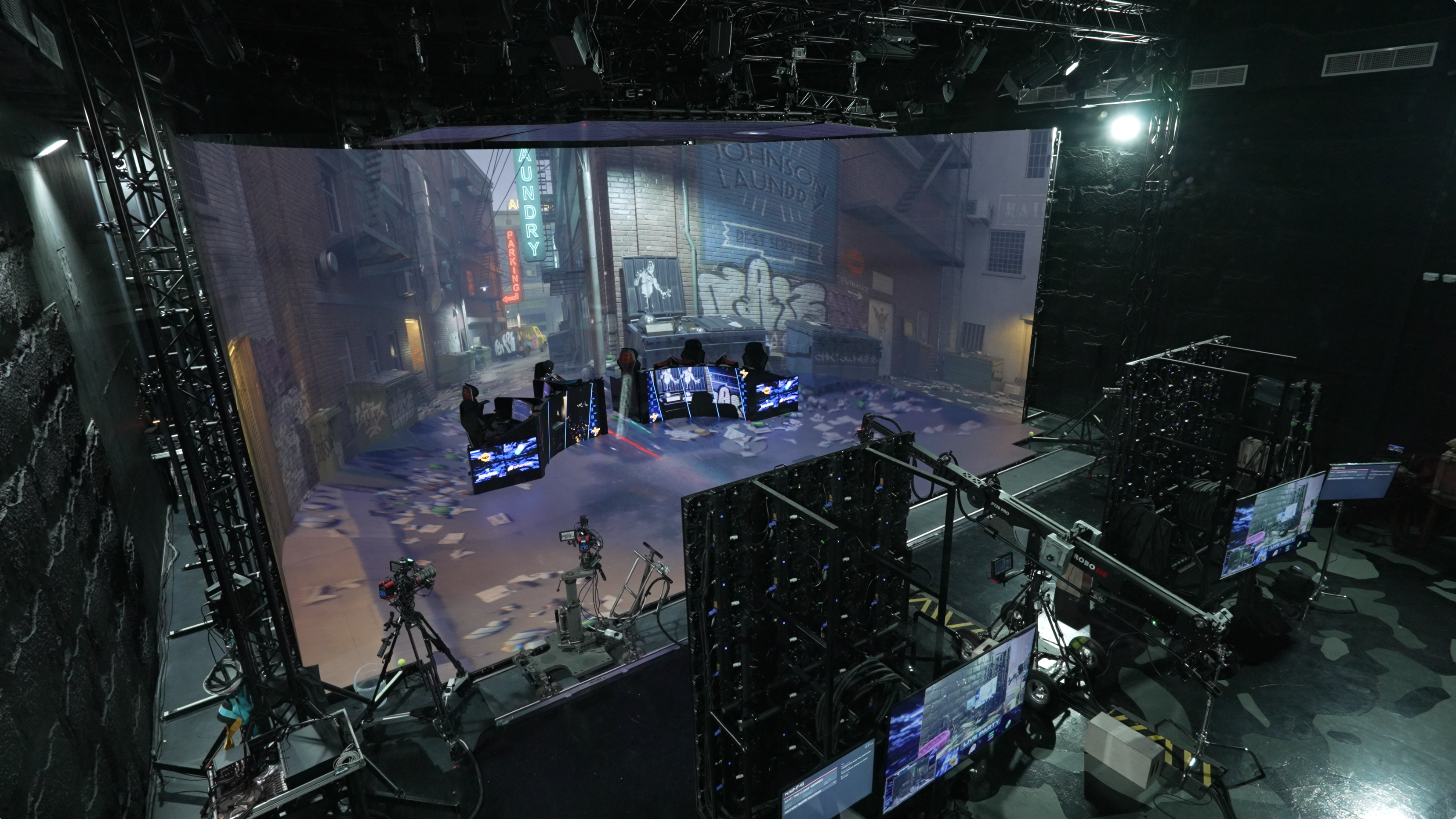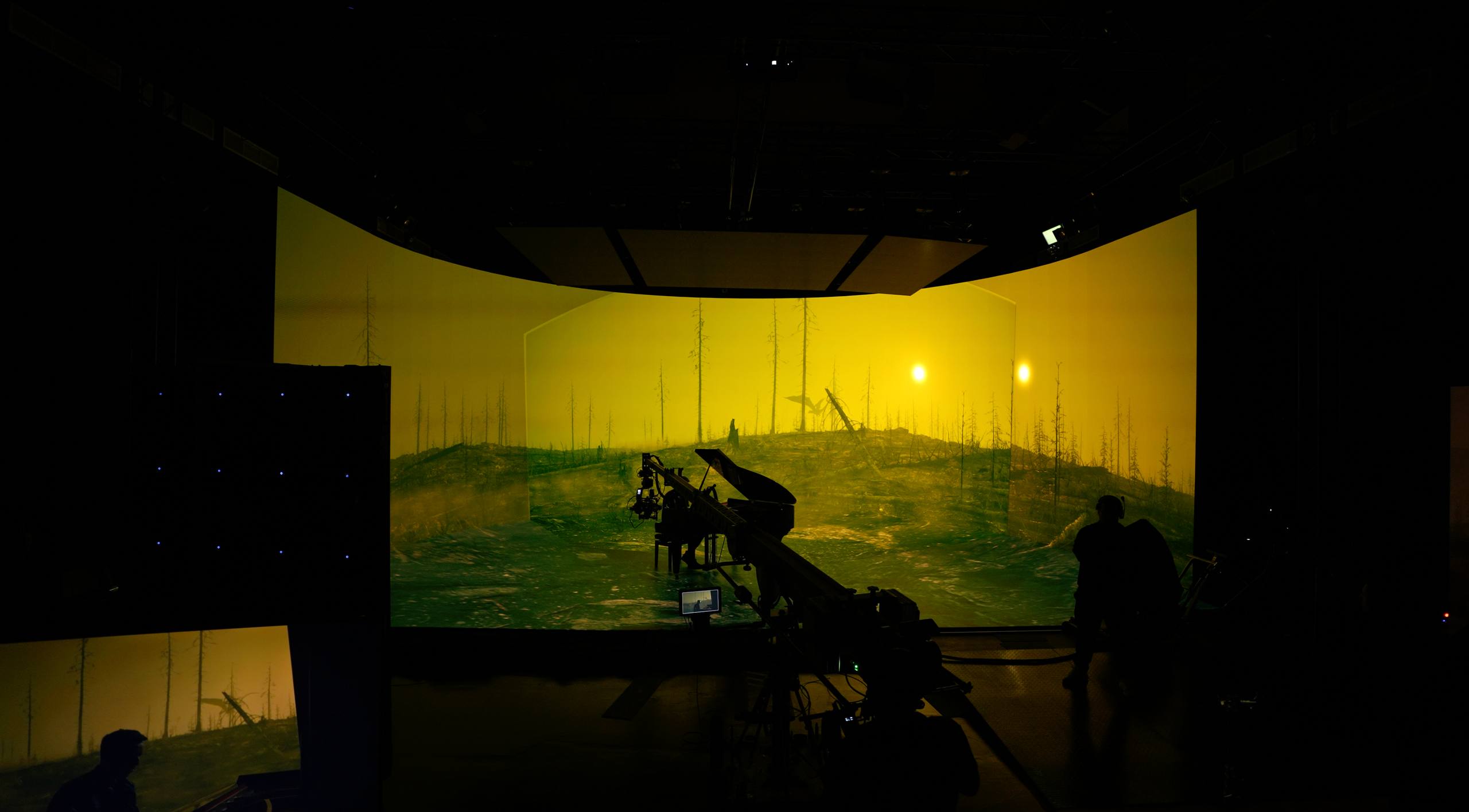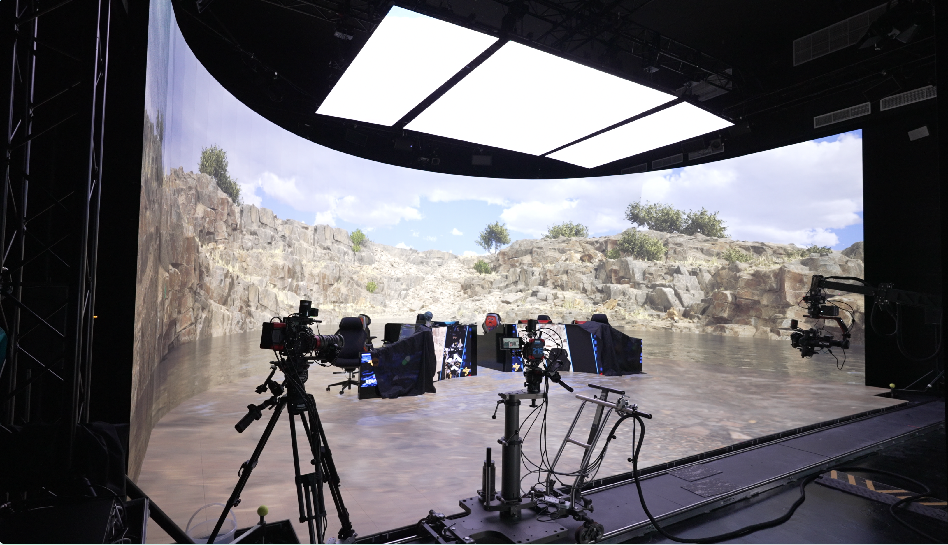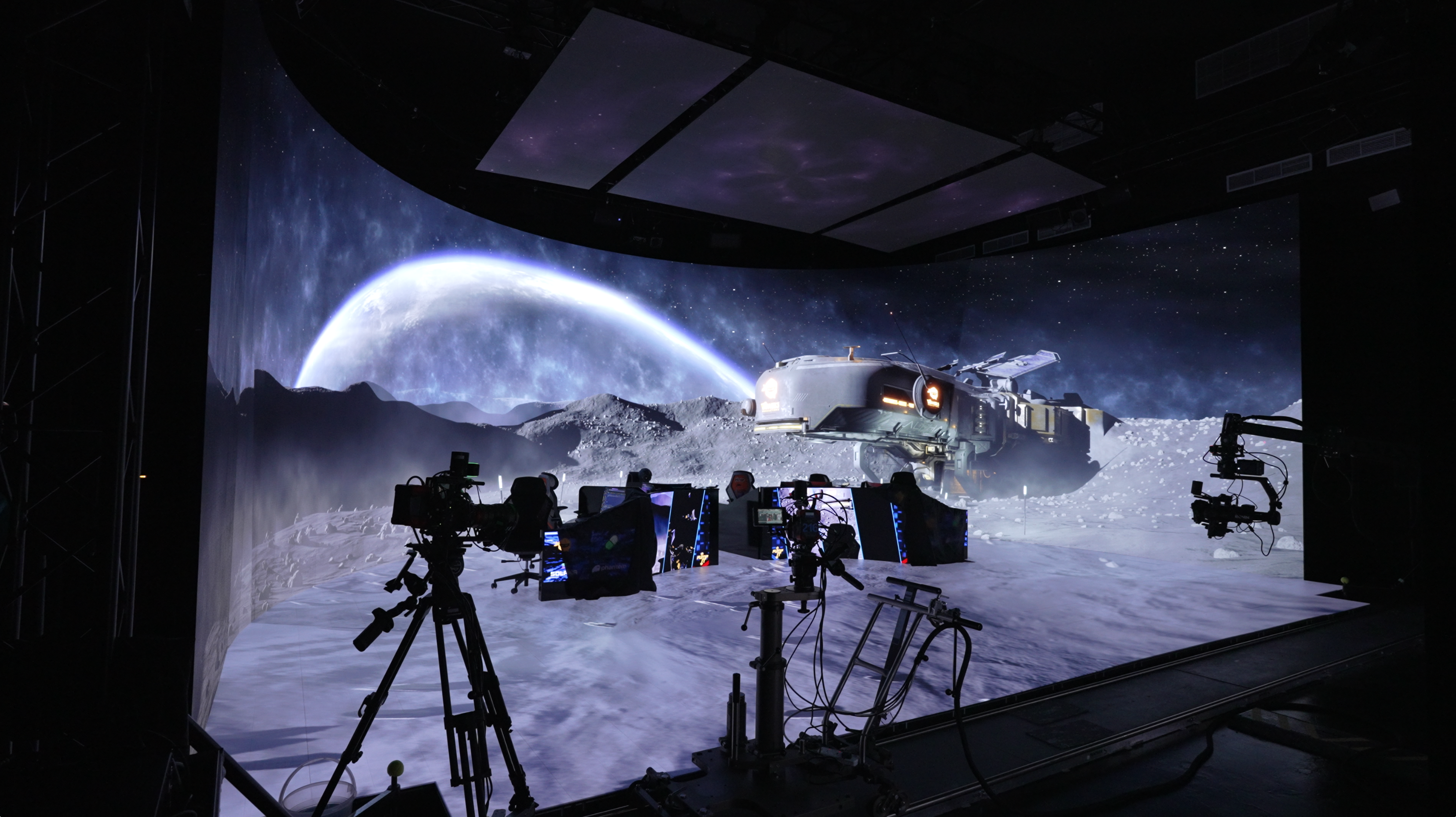 LED Volume: Massive curved wall with integrated floor panels for seamless, photorealistic backgrounds. Supports 10-bit and OCIO color transform for highest color accuracy.